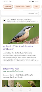 We were over the moon the other day when we saw an unusual visitor to the bird feeding station. We didn't recognise it at first but Google showed it to be a Nuthatch which made sense as he was hanging upside down on the peanut container and having a right old feast. I do hope we see him again soon.....